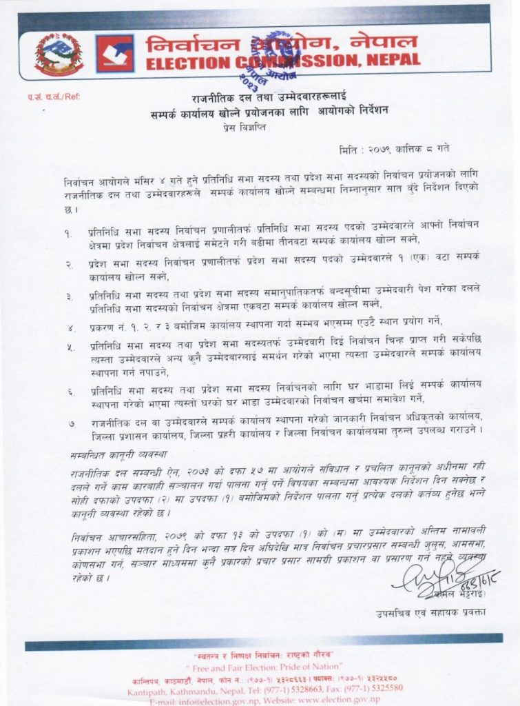 कार्तिक-८, मंसिर ४ मा हुने प्रतिनिधि सभा निर्वाचनका लागि उम्मेदवारी दिएका उम्मेदवारहरुले एकै निर्वाचन क्षेत्रमा ३ वटा भन्दा बढी सम्पर्क कार्यालय खोल्न नपाउने भएका छन् ।