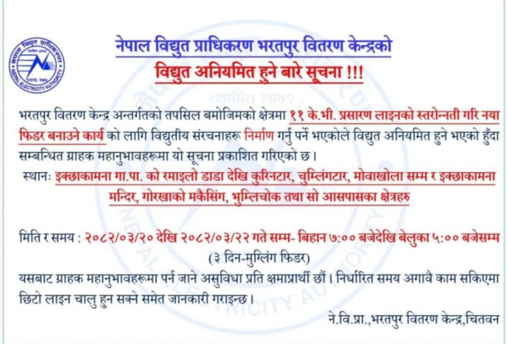 नेपाल विद्युत प्राधिकरण, भरतपुर वितरण केन्द्र चितवनले दिएको जानकारी अनुसार इच्छाकामना गाउँपालिकाको रमाइलो डाँडादेखि कुरिनटार, चुम्लिङटार, मोवाखोलासम्म र इच्छाकामना मन्दिर, गोरखाको मकैसिंह, भुम्लीचोक तथा सो आसपासका क्षेत्रमा ११ केभी प्रसारण लाइनको स्तरोन्नति गरी नयाँ फिडर बनाउने कार्यको लागि विद्युतीय संरचनाहरू निर्माण गर्नुपर्ने भएकोले मिति २०८२ असार २० गतेदेखि असार २२ गते ३ दिनसम्म बिहान ७:०० बजेदेखि बेलुका ५:०० बजेसम्म दैनिक १० घण्टा विद्युत सेवा अवरुद्ध हुने जनाइएको छ।