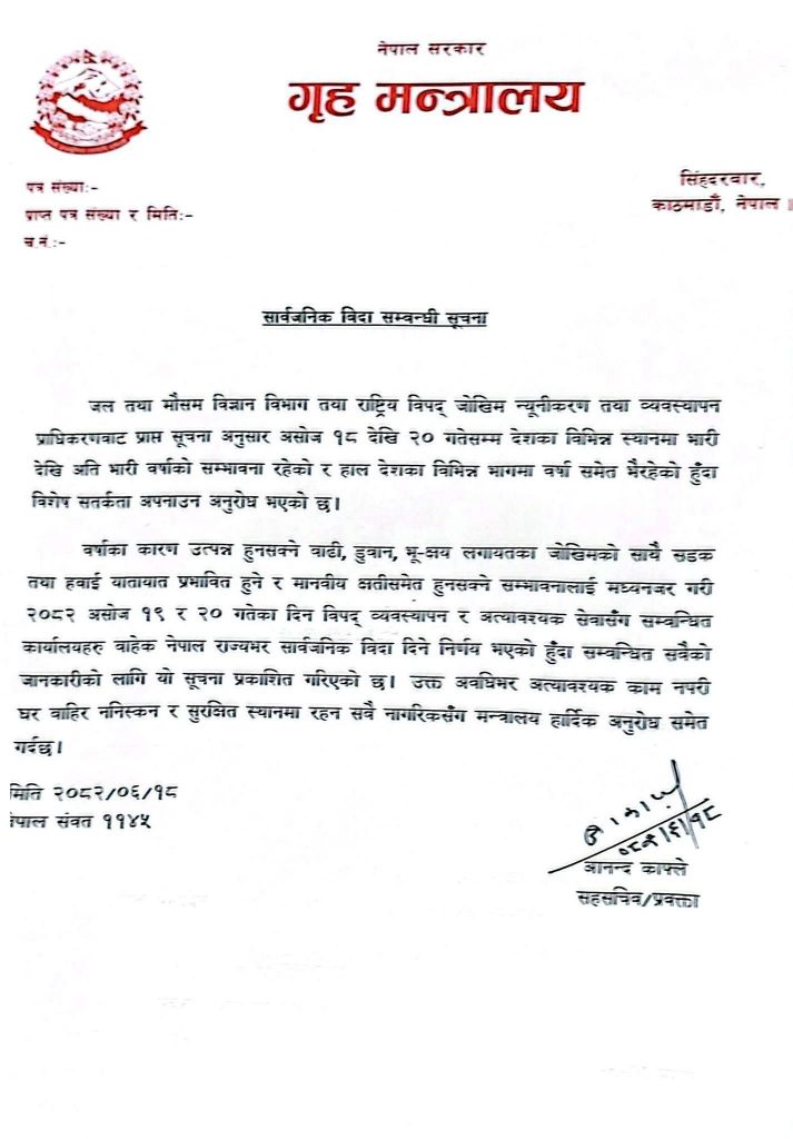 मन्त्रालयका प्रवक्ता तथा सहसचिव आनन्द काफ्लेले जारी गरेको सूचनामा उल्लेख छ, ‘वर्षाका कारणबाट उत्पन्न हुन सक्ने बाढी, डुबान, भूक्षय र सडक यातायात अवरोधका सम्भावनालाई मध्यनजर गर्दै असोज १९ र २० गते सार्वजनिक बिदा दिने निर्णय गरिएको हो ।’