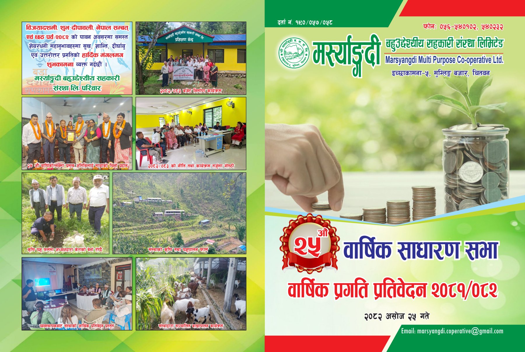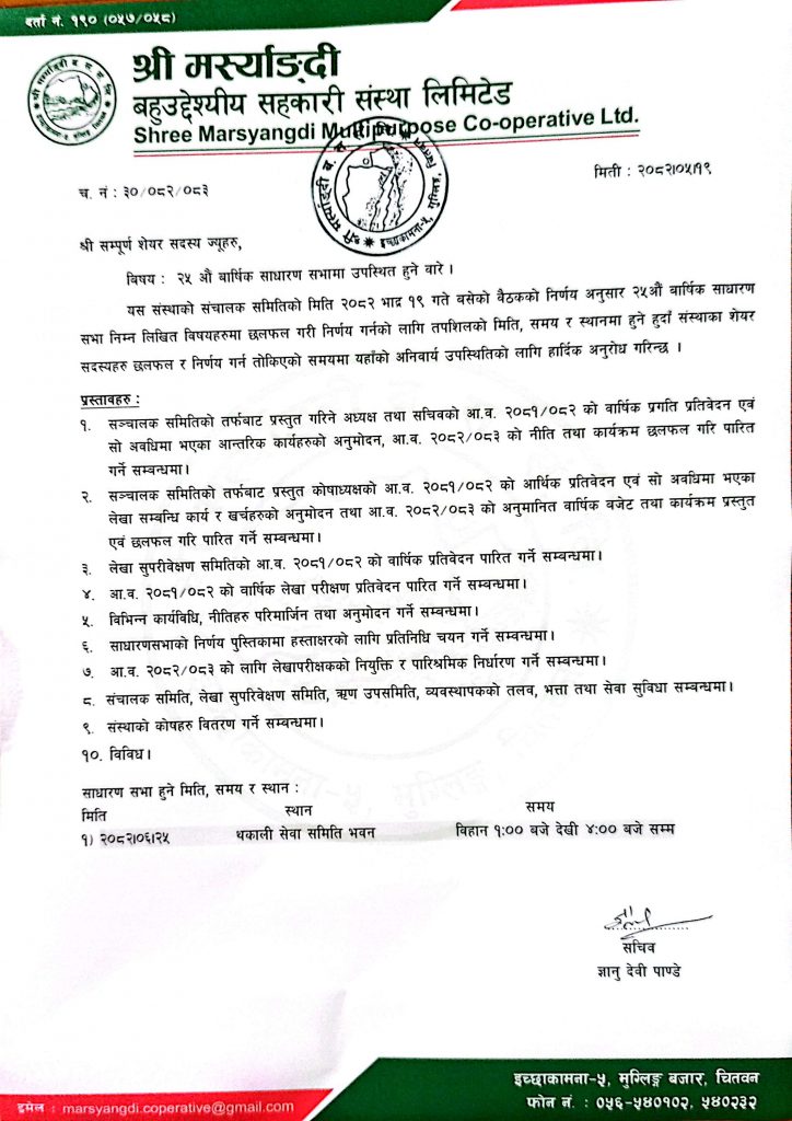 मुग्लिन-चितवनकै नमुना सहकारीका रूपमा रहेको इच्छाकामना-५, मुग्लिनमा अवस्थित मर्स्याङ्दी बहुउद्देश्यीय सहकारी संस्थाको २५ औं साधारण सभा असोज २५ गते शनिबार हुने भएको छ।