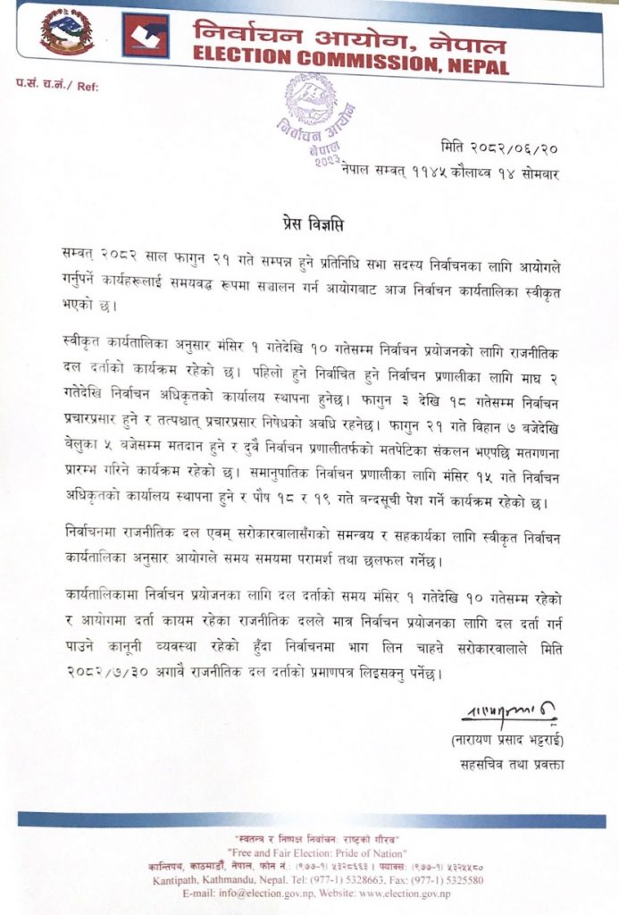 निर्वाचनमा भाग लिन चाहने सरोकारवालाले कात्तिक ३० अगावै राजनीतिक दल दर्ताको प्रमाणपत्र लिइसक्नु पर्नेछ आयोगद्वारा जारी विज्ञप्तिमा छ ।