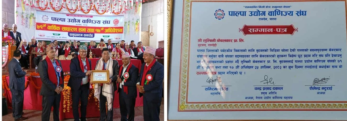 पाल्पा । लुम्बिनी प्रदेशकै पहिलो केबलकार स्थापना गरी पाल्पाको पर्यटन विकासमा योगदान गरेवापत लुम्बिनी केबलकार सम्मानित भएको छ । पाल्पा उद्योग वाणिज्य संघको ७१ औ साधारणसभाका अवसरमा केबलकारलाई सम्मान गरिएको हो । नेपाल उद्योग वाणिज्य महासंघका एसोसिएट उपाध्यक्ष हेमराज ढकाल र पाल्पा उद्योग बाणिज्य संघका संघका अध्यक्ष शैलेन्द्र भट्टराईले लुम्बिनी केबलकारका अपरेसन म्यानेजर वरिष्ठ इन्जिनियर डिएन कायस्थ सैंजूलाई सम्मानपत्र प्रदान गरेका हुन् । केबलकारले व्यवसायिक र अन्य संस्थासंग एमओयू गरेर कर्पोरेट छुट समेत दिंदै आएको छ । आईएमई ग्रुपको नेतृत्वमा स्थानीयको समेतको डेढ अर्ब लगानीमा स्थापना भई २०८० जेठ १५ देखि सञ्चालनमा आएको केबलकारले दैनिक ६ हजार पर्टटक आवत जावत गराउन सक्छ । लुम्बिनी केबलकार विश्वकै अत्याधुनिक, लोकप्रिय र सुरक्षित अष्ट्रियाको डुपलमायर कम्पनीबाट निर्मित केबलकार हो । केबलकार सञ्चालनमा आएको साढे २ वर्षमा उल्लेख्य संख्यामा भारतीय सहित तीन लाख बढी पर्यटक भित्राएको छ ।