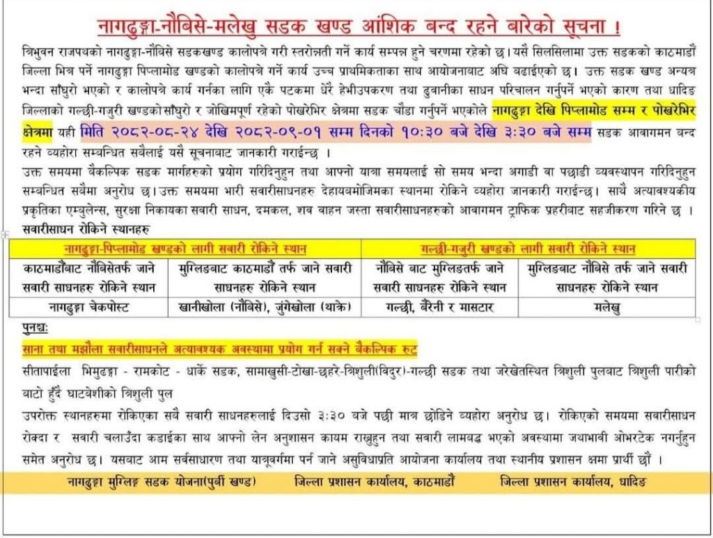 मंसिर-२२, नागढुंगा–नौबिसे–मलेखु सडक खण्ड मंसिर २४ देखि पुस १ गतेसम्म दैनिक ५ घण्टा बन्द हुने भएको छ ।