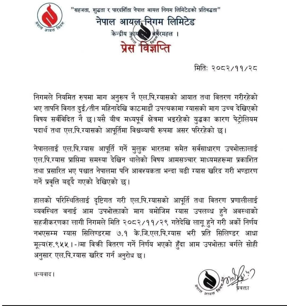 हालको परिस्थितिलाई दृष्टिगत गरी आपूर्ति तथा वितरण प्रणालीलाई व्यवस्थित बनाउन निगमले नयाँ व्यवस्था लागू गरेको हो । आम उपभोक्ताको मागबमोजिम ग्यास उपलब्ध गराउन सहज होस् भन्ने उद्देश्यले २०८२ फागुन २९ गतेदेखि लागू हुने गरी अर्को निर्णय नभएसम्मका लागि प्रतिसिलिन्डर ७.१ केजी मात्र ग्यास भरी बिक्री गरिनेछ ।