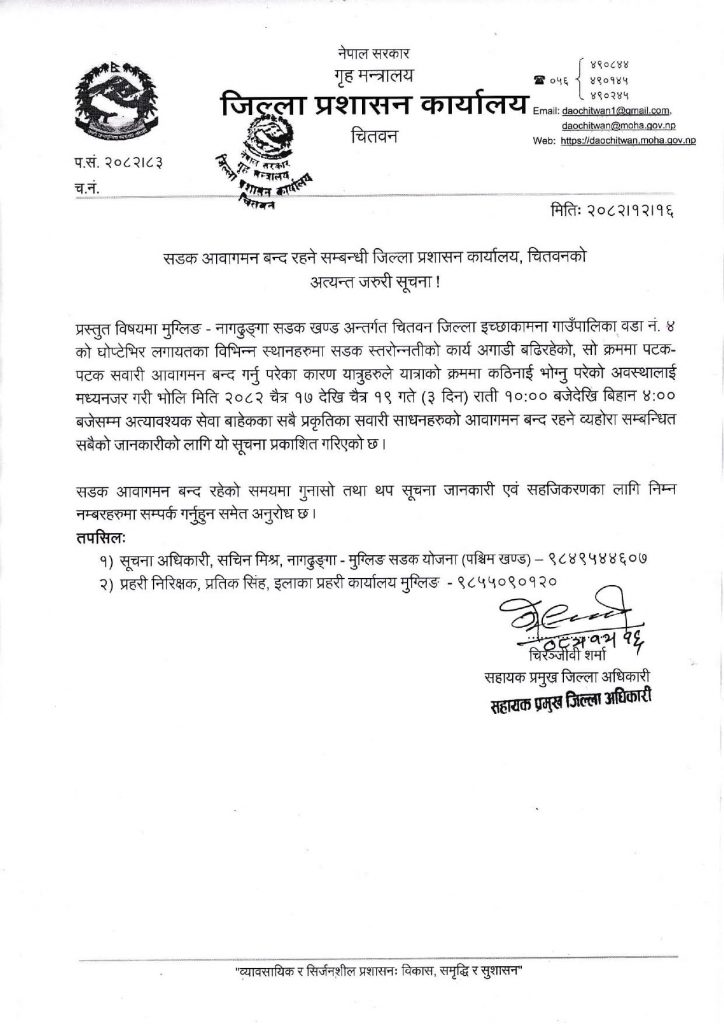 जिल्ला प्रशासन कार्यालय चितवनले दिएको जानकारी अनुसार इच्छाकामना गाउँपालिका वडा नं. ४ को घोप्टेभिर लगायतका विभिन्न स्थानहरुमा सडक स्तरोन्नतीको कार्य अगाडी बढिरहेको र सो क्रममा पटक-पटक सवारी आवागमन बन्द गर्नु परेका कारण यात्रुहरुले यात्राको क्रममा कठिनाई भोग्नु परेको अवस्थालाई मध्यनजर गरी भोलि चैत्र १७ देखि चैत्र १९ गते राती १०:०० बजेदेखि बिहान ४:०० बजेसम्म दैनिक ६ घण्टा अत्यावश्यक सेवा बाहेकका सबै प्रकृतिका सवारी साधनहरुको आवागमन बन्द हुनेछ।