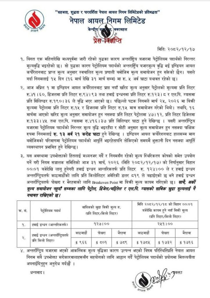 आज राति १२ बजेपछि लागु हुने गरी पेट्रोल, डिजेल, मट्टितेल र खाना पकाउने एलपी ग्यासको मूल्य यथावत् राखी हवाई इन्धनको मूल्य बढाइएको निगमले जनाएको छ ।
